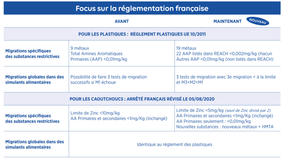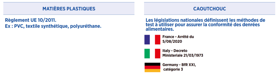 La compatibilité alimentaire est régie par le règlement européen (CE) n°1935/2004 relatif aux matériaux et objets destinés à entrer en contact avec des denrées alimentaires.