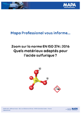 Quels matériaux adaptés pour l'acide sulfurique ? Quelles alternatives au nitrile propose Mapa Professional pour la manipulation de l'acide sulfurique concentré ? Télécharger (PDF - 1,34 Mb)Livre Blanc - Mapa Professional vous informe sur la norme EN 388